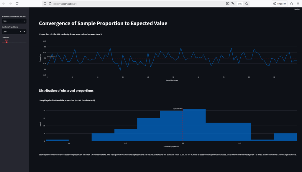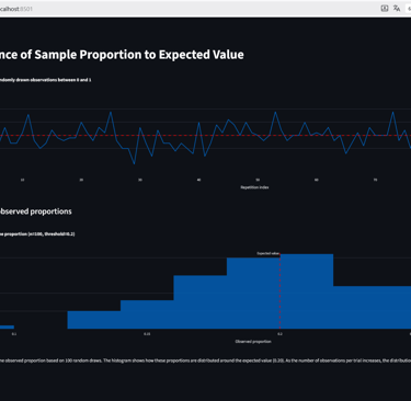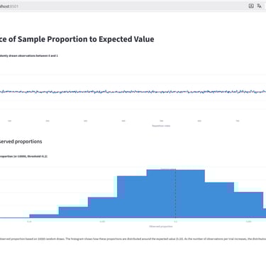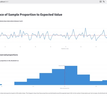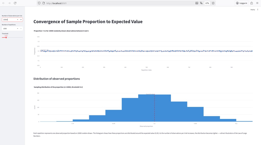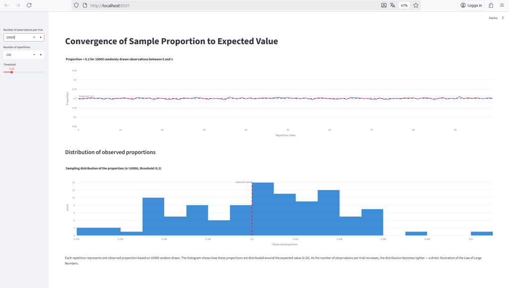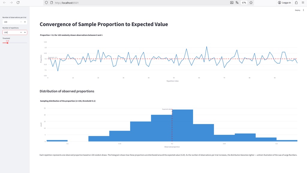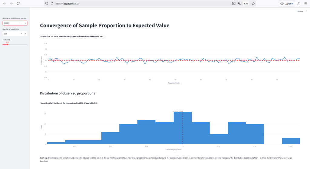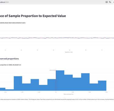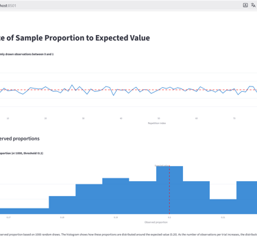 At the top left, you can control the number of observations per trial — this determines how many random values are drawn from the uniform distribution to calculate the proportion below the selected threshold. The threshold, set by the slider (default: 0.2), defines what counts as a “success” in each trial.